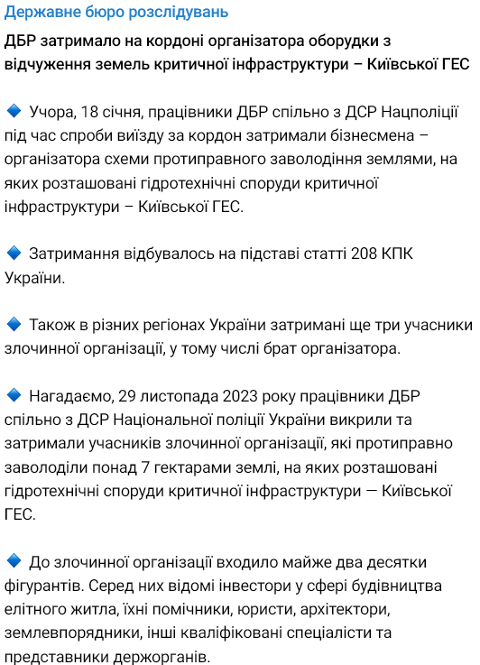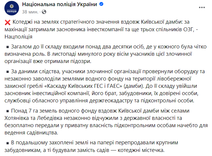 Нацполиция, не называя имен, сообщила, что основателя инвесткомпании "и еще трех подельников" задержали за махинации с землей стратегического значения вдоль Киевской дамбы.
