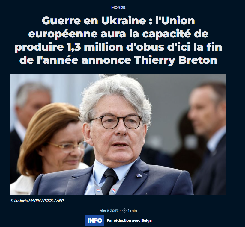 "С такой мощностью, чтобы производить миллион снарядов, мы должны убедиться, что большинство из них попадает в Украину в приоритетном порядке. Потому что именно там есть неотложная потребность", - добавил Бретон.