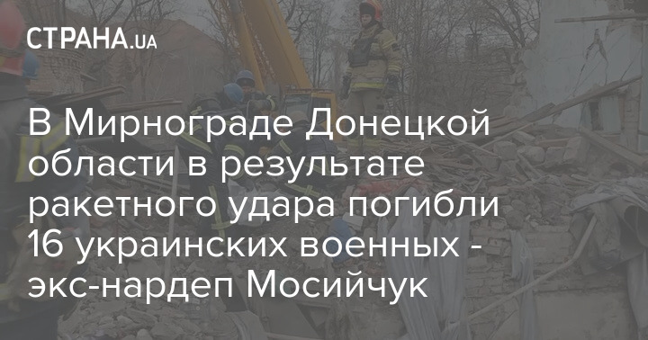 Экс-нардеп Игорь Мосийчук заявляет, что в Мирнограде Донецкой области в результате ракетного удара в ночь с 20 на 21 января погибли 16 украинских военных, более 20 находятся под завалами.