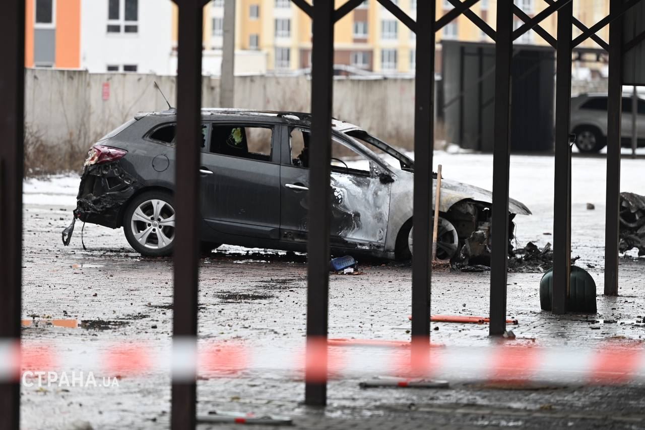 07.38 Горящие автомобили в Святошинском районе Киева после ракетной атаки.