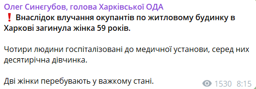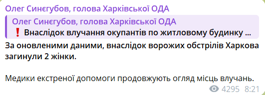 Позже глава Харьковской ОВА Олег Синегубов сообщил, что в результате попадания по жилому дому в Харькове погибли две женщины.