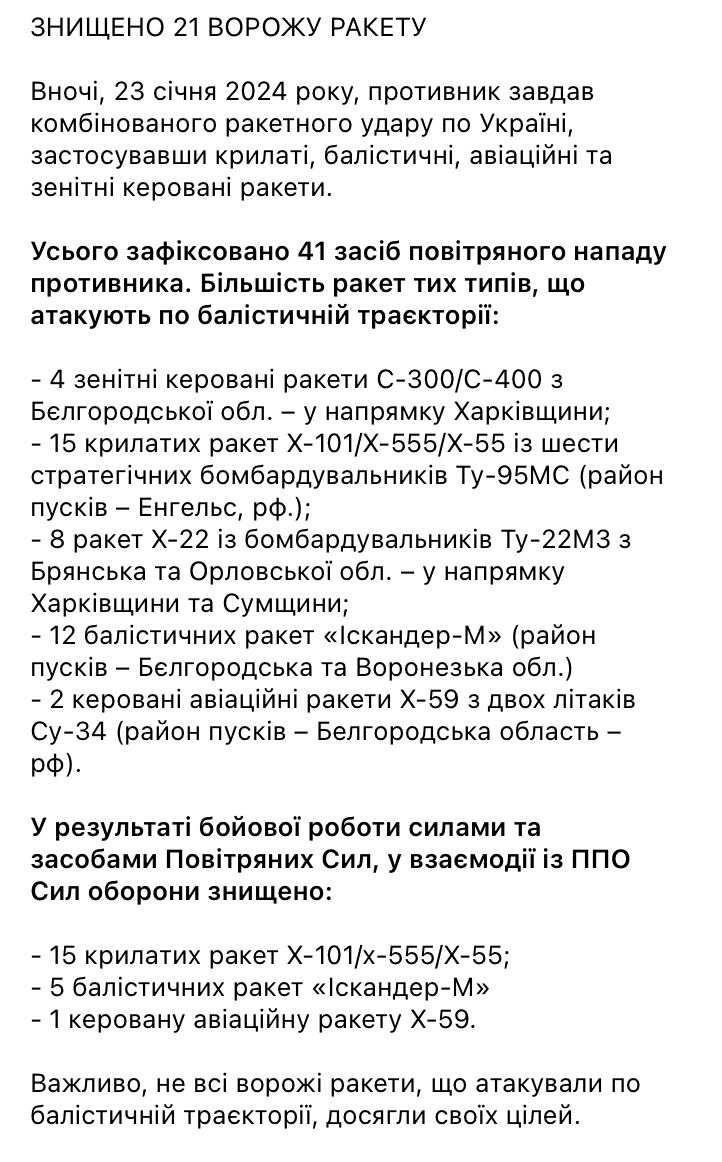 Сегодня Россия нанесла комбинированный ракетный удар по Украине, применив крылатые, баллистические, авиационные и зенитные управляемые ракеты. ВСУ сбили 21 ракету из 41.