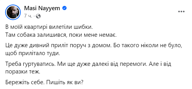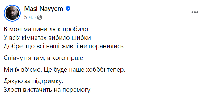 "У моей машины люк пробило. Во всех комнатах выбило стекла. Хорошо, что все наши живы и не поранились. Соболезнование тем, у кого хуже", - написал Маси Найем.