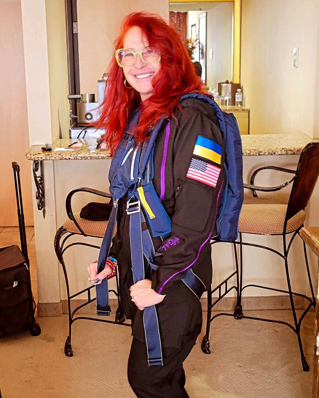 На сайте указано, что Бороздина - частный астронавт "из Украины и Лас-Вегаса". На фото Лина позирует в костюме, на рукаве которого нашиты флаги США и Украины.