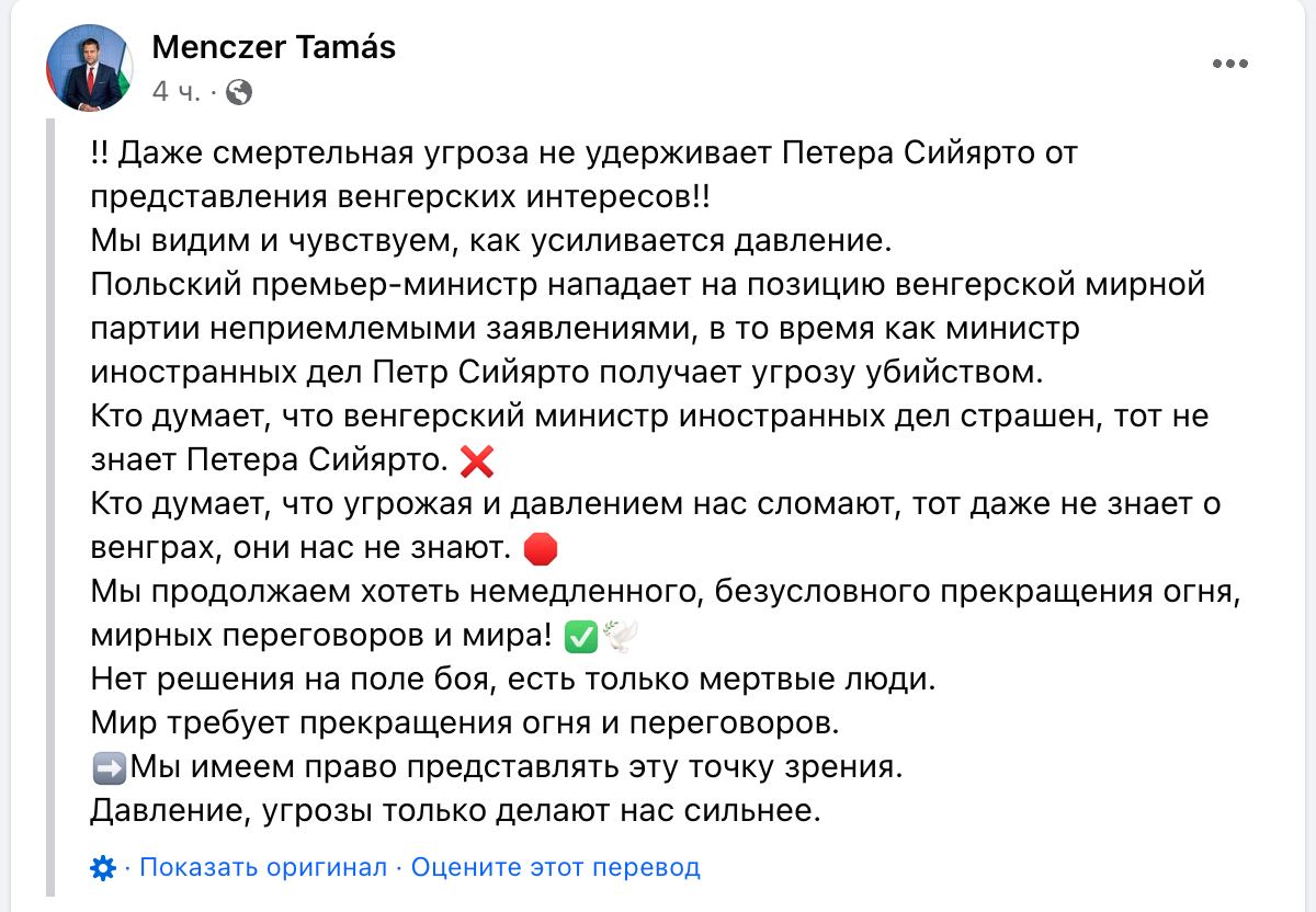 "Мы по-прежнему хотим немедленного, безоговорочного прекращения огня, мирных переговоров и мира", — заявил госсекретарь по иностранным делам Тамаш Менцер.
