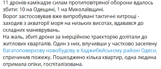 "К сожалению, сбитые дроны по инерционной траектории долетали до жилых кварталов. Один из них, попав в частично заселенную многоэтажную новостройку в Хаджибейском районе Одессы, вызвал пожар. Повреждены несколько квартир, один человек получил ожоги, госпитализирован.