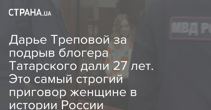 В российском Санкт-Петербурге Второй Западный окружной военный суд приговорил Дарью Трепову к 27 годам колонии строгого режима. Приговор вынесен по делу о теракте, в результате которого погиб военкор Владлен Татарский (настоящее имя — Максим Фомин), а еще 52 человека пострадали.