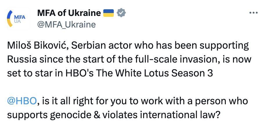 "Милош Бикович, сербский актер, который поддерживал Россию с начала полномасштабного вторжения, теперь собирается сыграть главную роль в третьем сезоне сериала НВО "Белый лотос". HBO, вам нормально работать с человеком, который поддерживает геноцид?" – сказано в посте ведомства.