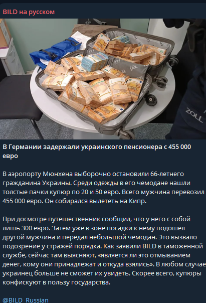 Как сообщает издание, в аэропорту Мюнхена для проверки выборочно остановили 66-летнего гражданина Украины. Среди одежды в его чемодане нашли толстые пачки купюр по 20 и 50 евро. Всего мужчина перевозил 455 000 евро. Он собирался вылететь на Кипр.