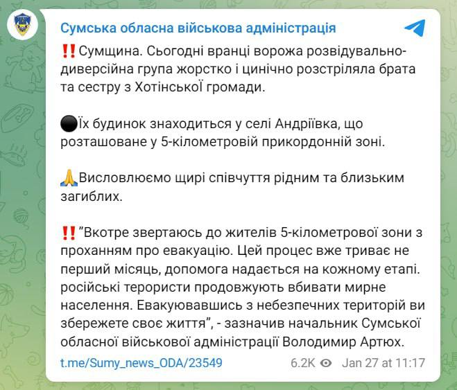 В Сумской области российские диверсанты убили двух мирных жителей.