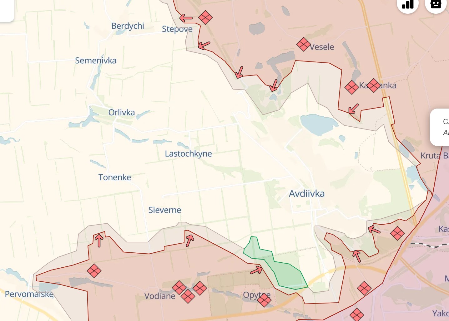 Институт изучения войны заявляет и о продвижении РФ к северу от Степного (к северо-западу от Авдеевки) и подтверждает, что россияне прошли вперед к юго-востоку от Первомайского.