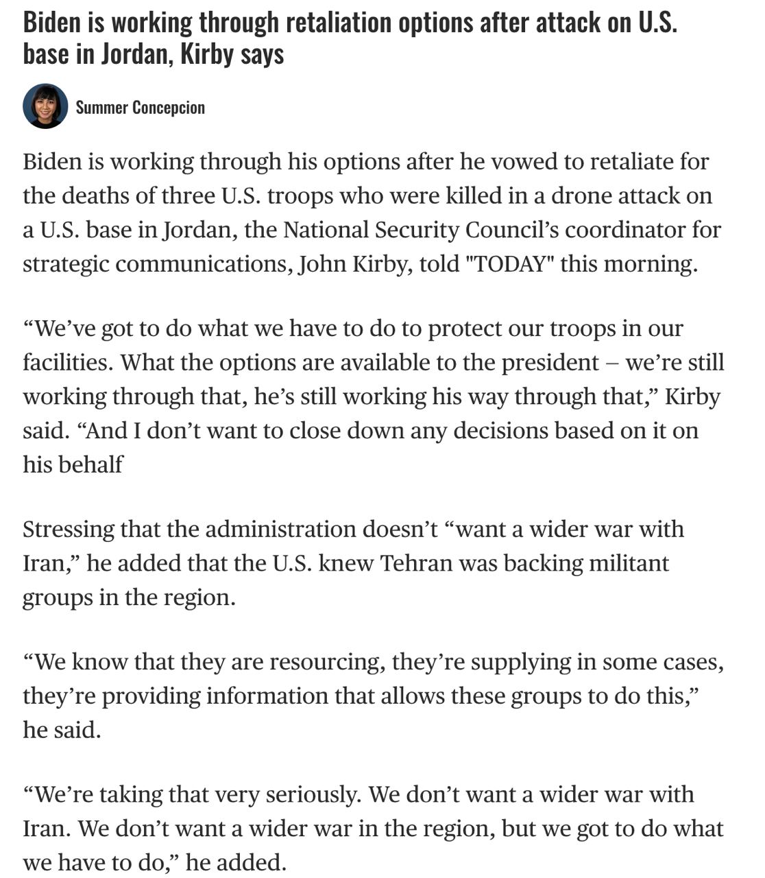 Тем временем координатор стратегических коммуникаций Совета нацбезопасности США Джон Кирби заявил, что США не хотят "более широкой войны с Ираном", но должны ответить на гибель трех американских военнослужащих во время удара по базе.