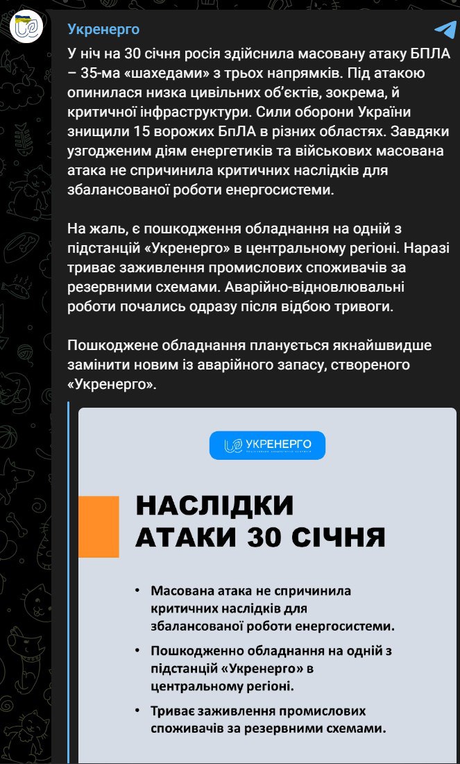 09.12 После ночной атаки "Шахидов" пострадала одна из подстанций в центре Украины, сообщает "Укрэнерго". Она питала промышленных потребителей.