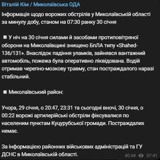 Также глава ОВА Виталий Ким сообщил, что в Николаевской области был уничтожен БПЛА типа "Shahed-136/131". В результате падения обломков, загорелся грузовой автомобиль, пожар был оперативно ликвидирован.