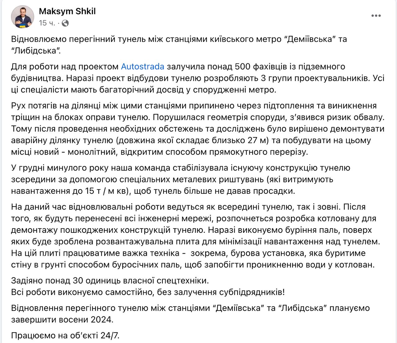 Ранее о том, что будут строить новый тоннель метро, а не ремонтировать, говорил экс-советник мэра Кличко Максим Бахматов. Он прогнозировал, что метро в итоге откроют не через полгода, как обещали, а через несколько лет.