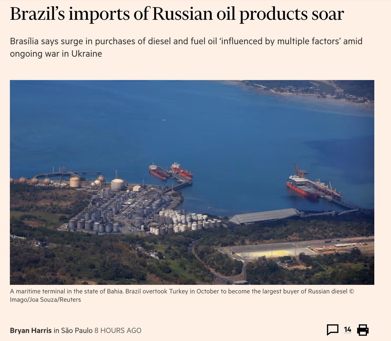 Бразилия в прошлом году стала крупнейшим покупателем российского дизельного топлива. РФ обогнала США как крупнейшего поставщика в Бразилию. Ее доля выросла с 50% до 85%.
