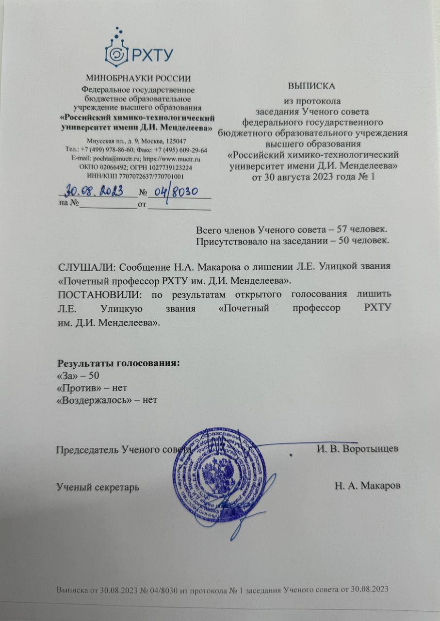 В документе говорится, что члены совета лишили Улицкую почетного звания еще на заседании 30 августа 2023 года. За это решение проголосовали все 50 участников встречи. Решение совета связано с "обращением гражданина". Какого именно, в вузе не уточнили.