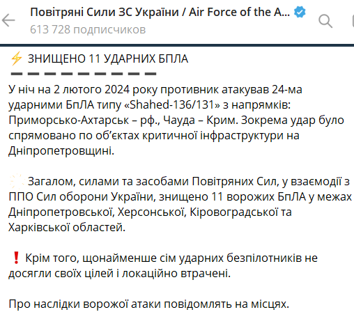 Ночью 2 февраля россияне атаковали Украину 24 ударными беспилотниками типа "Shahed-136/131". Силы ПВО сбили 11 дронов. Еще семь беспилотников не достигли своих целей.