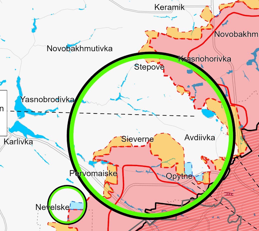 Если посмотреть на карту, то очевидны попытки россиян сжать кольцо вокруг украинского гарнизона в Авдеевке. Для этого они пытаются полностью захватить район карьера на севере города (где уже у них есть продвижение), а на юге города пробиться к району многоэтажек "9 квартал", который является "сердцем" обороны Авдеевки - оттуда просматривается и простреливается весь город. Если россияне смогут осуществить эти действия, то украинские войска в остальной части Авдеевки окажутся под угрозой полного окружения и встанет вопрос о необходимости их вывода из города.