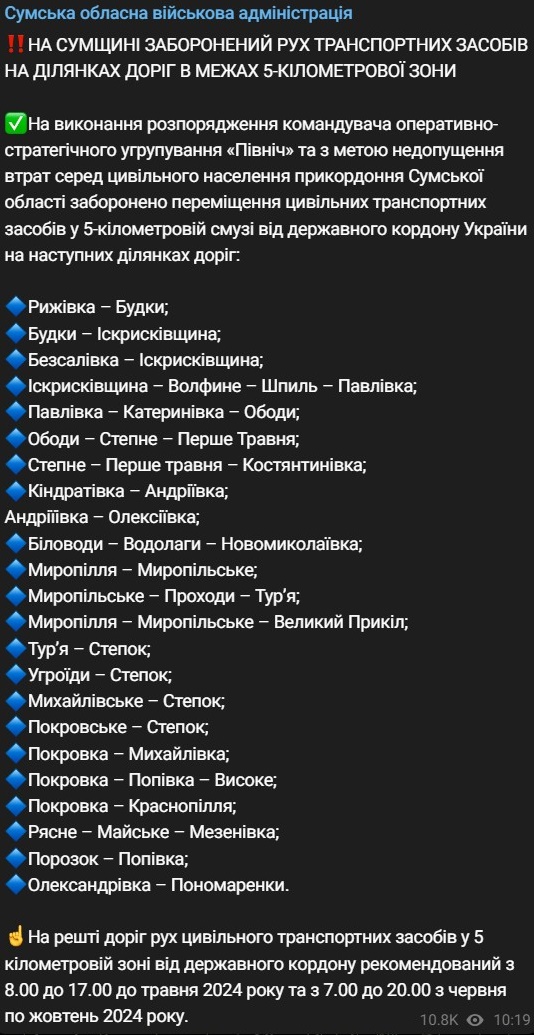 Сообщается, что с целью недопущения потерь среди гражданского населения приграничья Сумской области запрещено перемещение гражданских транспортных средств в 5-километровой полосе от государственной границы Украины на следующих участках дорог: