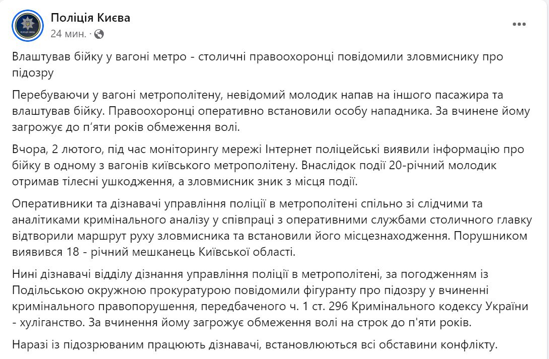 Киевская полиция сообщила о подозрении 18-летнему парню за жестокое избиение в метро