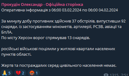 По Херсонской области РФ выпустила 92 снаряда, с применением минометов, артиллерии, РСЗО, авиации и БПЛА