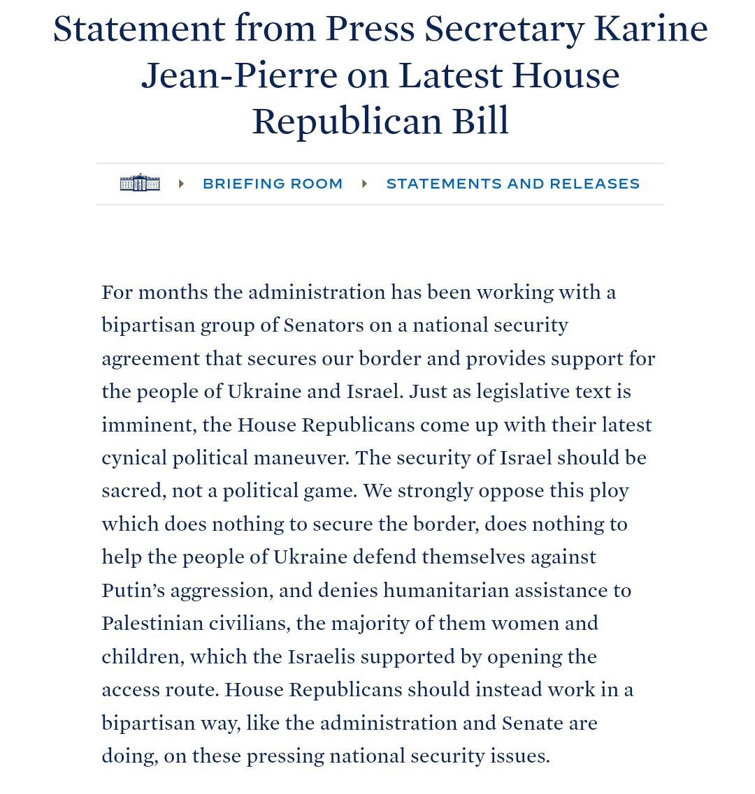 Там призвали Палату представителей дождаться законопроекта, который должны скоро представить в Сенате (он будет включать договоренности по мигрантам, Украине и Израилю в одном пакете).
