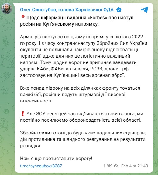 Глава Харьковской ОВА Олег Синегубов прокомментировал информацию издания. В своем телеграм-канале он заявил, что уже более полугода на этом участке фронта продолжаются тяжелые бои, россияне ведут штурмовые действия высокой интенсивности, а ВСУ отражают атаки.