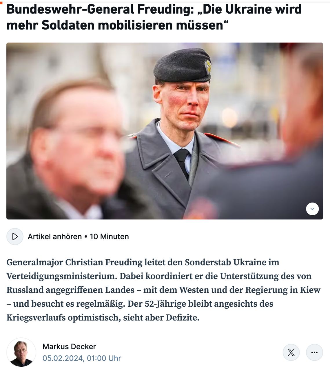 "Украине, безусловно, придется мобилизовать больше солдат – просто из-за количества потерь, насколько мы видим. Но еще и потому, что войска, часть которых находится на фронте уже 24 месяца, нуждаются в обновлении", - заявил он в интервью RND.