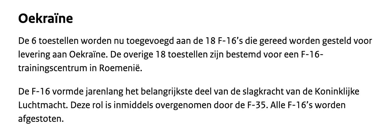 16:36 Нидерланды передадут Украине еще шесть самолетов F-16, в добавок к обещанным ранее 18.