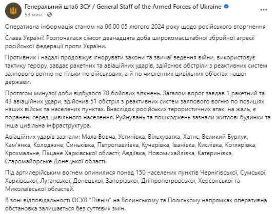 В понедельник, 5 февраля, Генштаб ВСУ обнародовал сводку о ситуации на фронте.