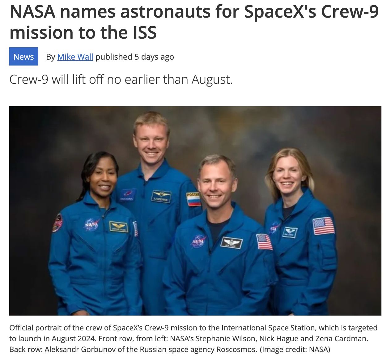 На Международную космическую станцию в рамках миссии SpaceX Crew-9 отправятся космонавт "Роскосмоса" Александр Горбунов и три астронавта NASA: Зена Кардман, Ник Хейг и Стефани Уилсон.