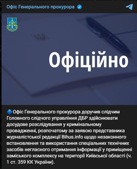 Офис генерального прокурора поручил следователям ГБР провести предварительное расследование по уголовному делу, инициированному по заявлению представителя редакции Bihus.info о незаконной установке и использовании специального технического оборудования для скрытого сбора информации в помещении загородного комплекса на территории Киевской области, сказано в сообщении.
