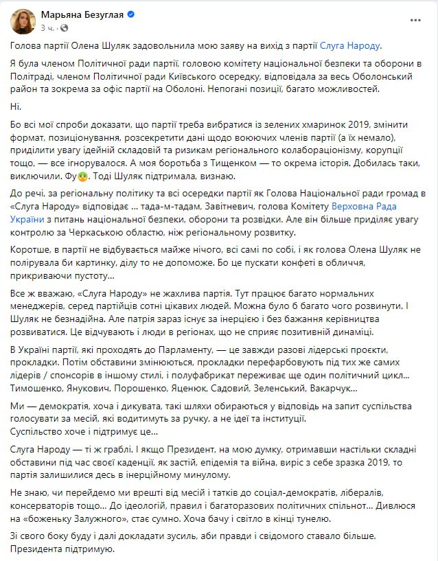 Глава партии "Слуга народа" Елена Шуляк удовлетворила заявление нардепа Марьяны Безуглой о выходе из политсилы.
