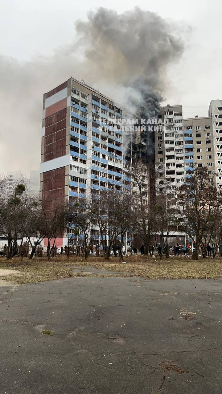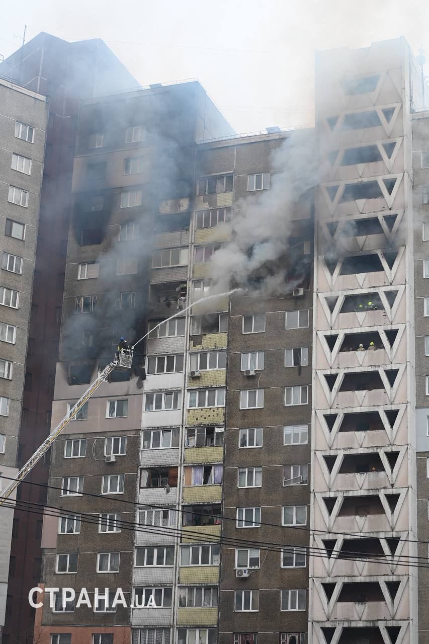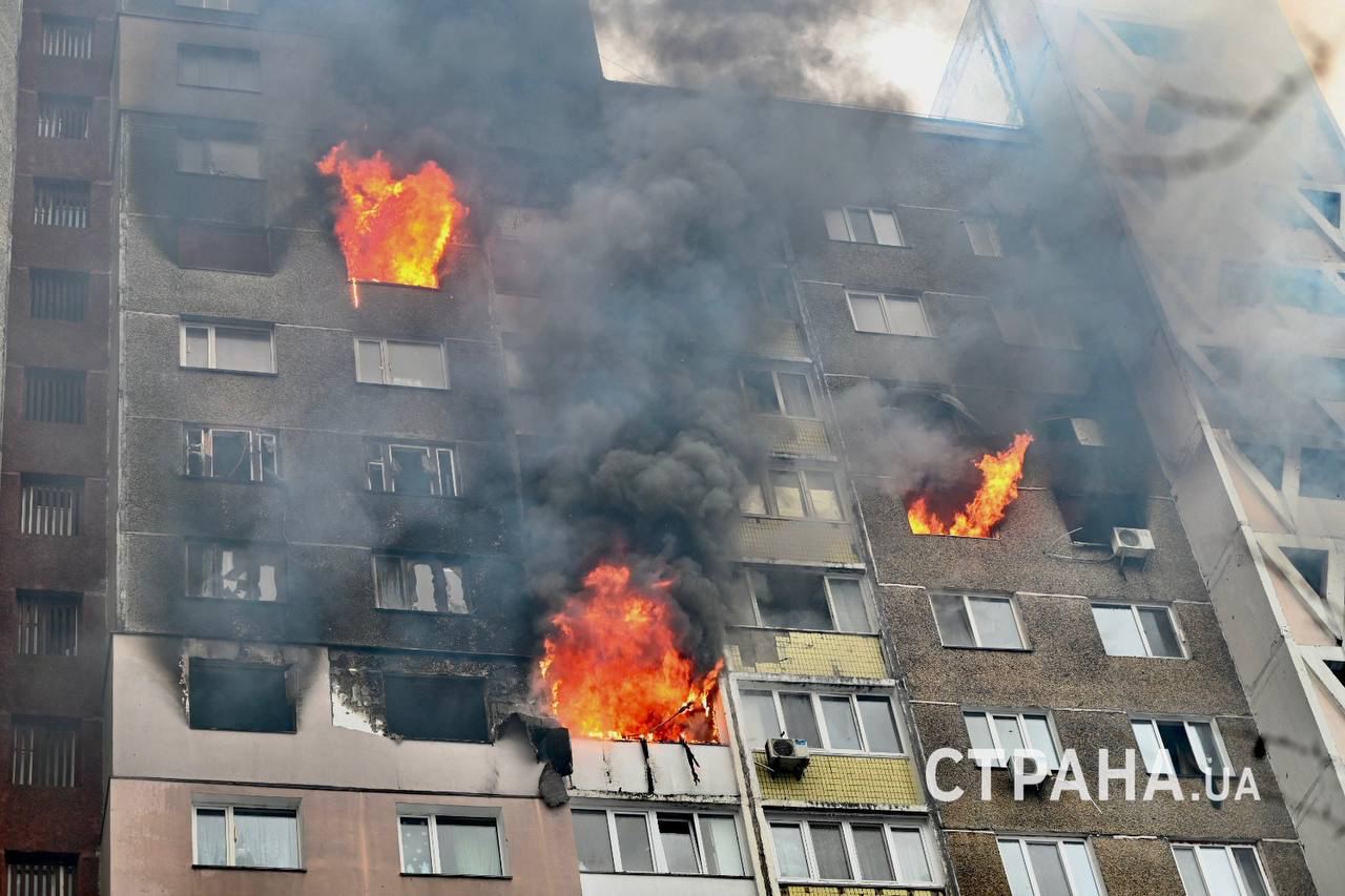 09.25 Видео с места прилета в Голосеевском районе Киева от читателей «Страны», где горит многоэтажка.