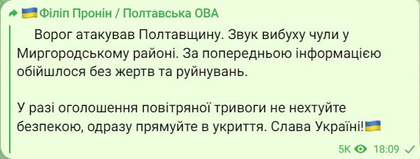 18:11 Глава Полтавской ОВА Филипп Пронин подтвердил взрыв в районе Миргорода.