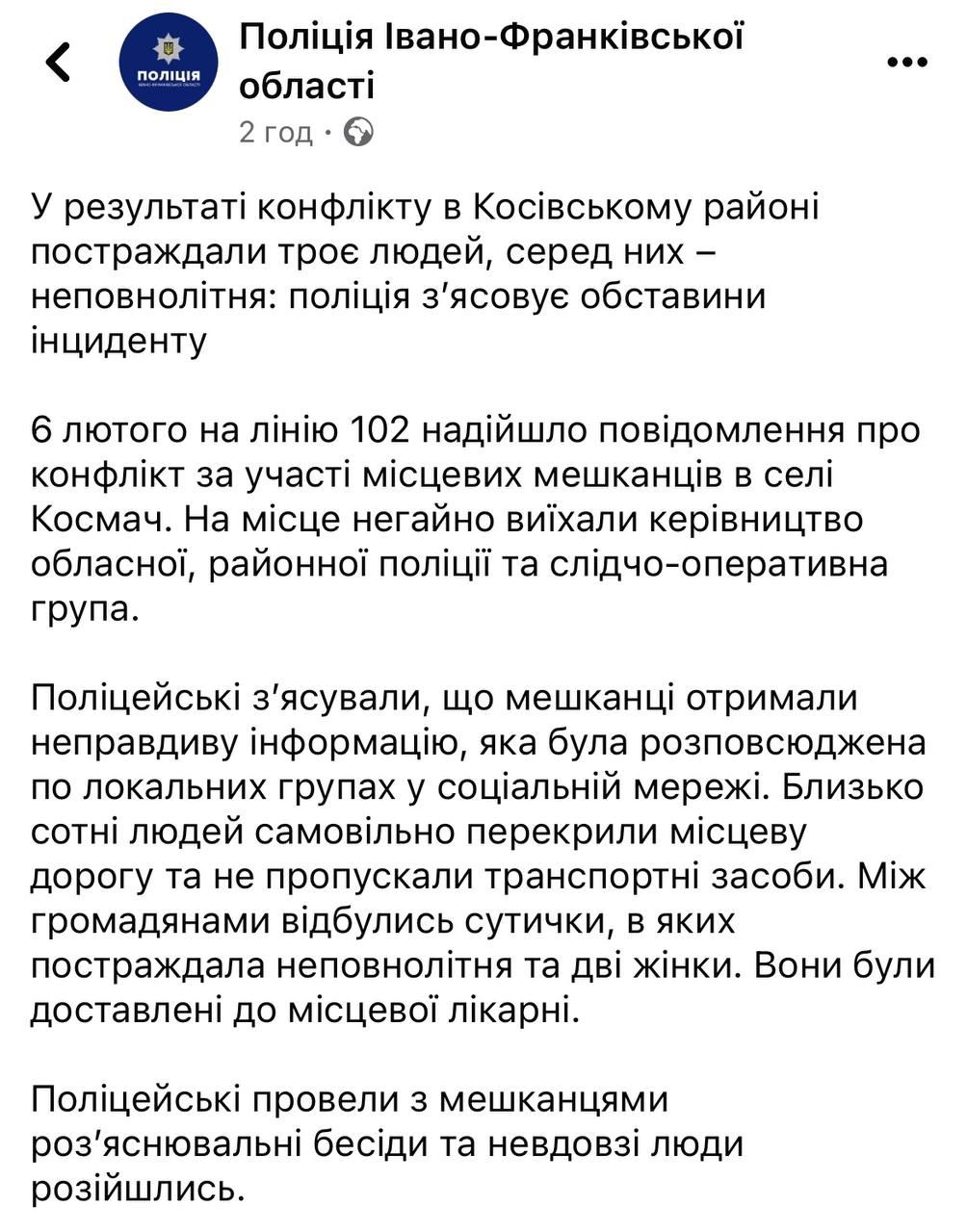 Полиция подтверждает, что имело место самовольное перекрытие дороги и конфликт с тремя пострадавшими, в том числе одним ребенком, из-за "неправдивой информации, которая распространилась в соцсетях".