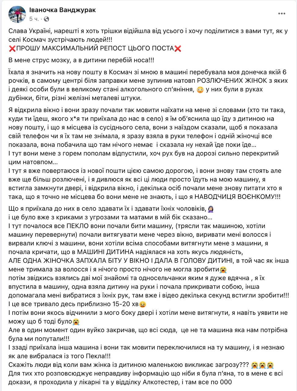 В селе Космач Ивано-Франковской области группа женщин перекрыла дорогу и избила мать с ребенком из-за рейдов ТЦК. Пострадавшая рассказывает, что ее обвинили в том, что она якобы "наводчица военкома", которая приехала "сдавать их мужей".