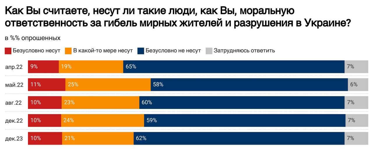 При этом 62% опрошенных россиян не считают, что они несут ответственность за гибель мирных жителей Украины. 21% считают, что несут "в какой-то мере", 10% - что безусловно несут.