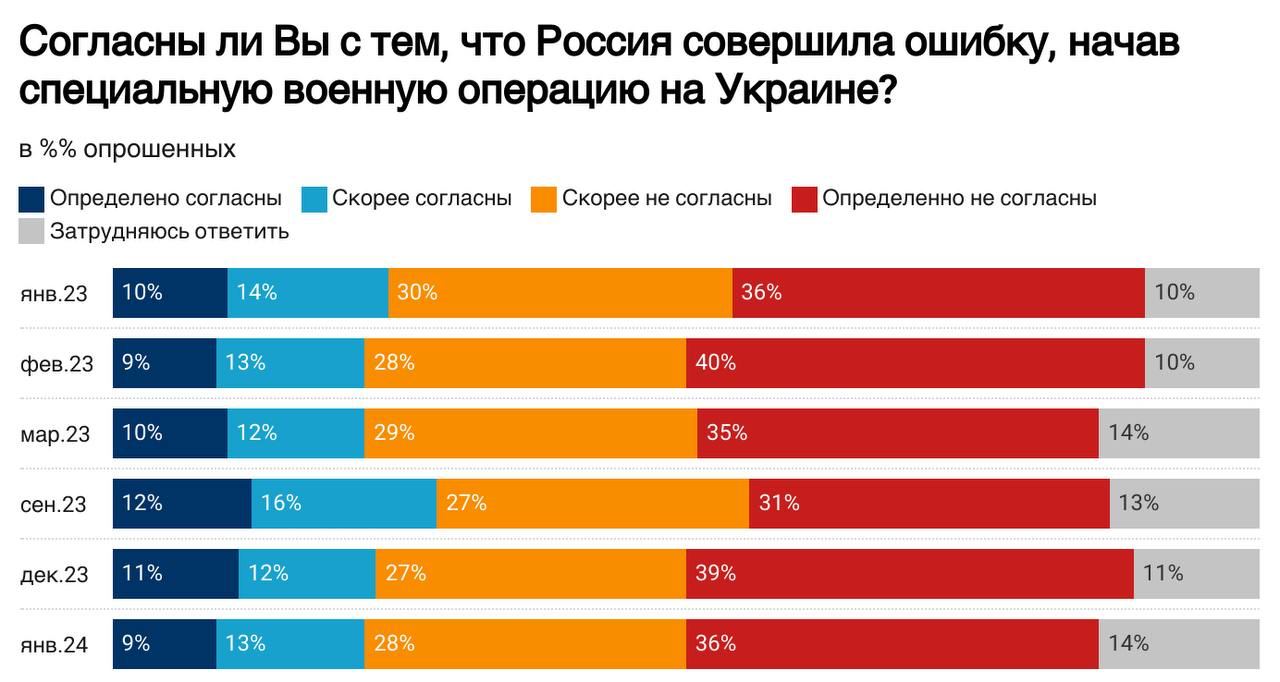 Но 64% не согласны, что вторгаться в Украину было ошибкой.