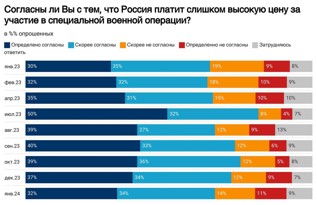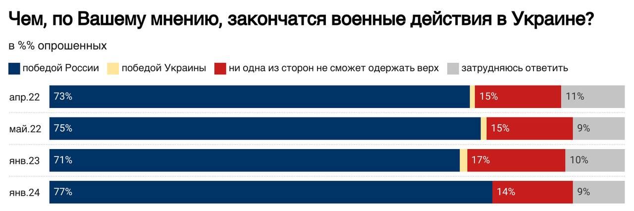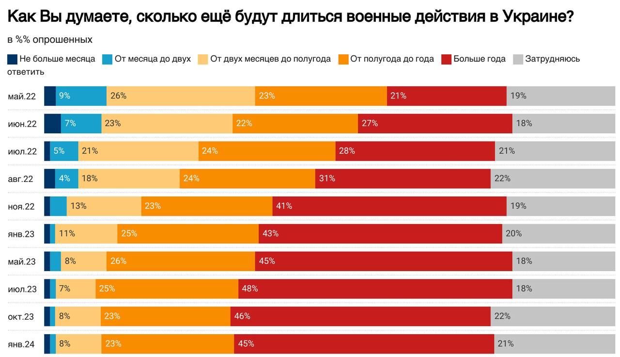 Относительное большинство (45%) считают, что война продлится еще больше года. 77% уверены, что она закончится победой РФ. Хотя 66% считают, что РФ платит за эту войну "слишком высокую цену".