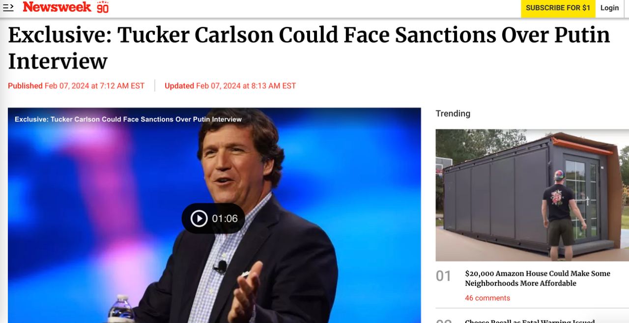 Напомним, само интервью Путина, вероятно, будет опубликовано завтра, 8 февраля. Анонс интервью набрал у Такера Карлсона уже больше 50 миллионов просмотров в Х.
