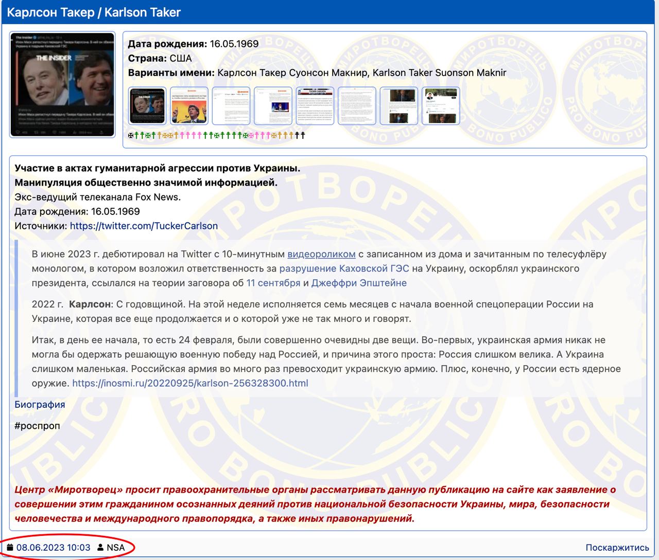 Также СМИ сегодня написали, что Карлсона внесли на "Миротворец". На самом деле он находится в базе еще с июня 2023 года, когда он обвинил Украину в подрыве Каховской ГЭС.