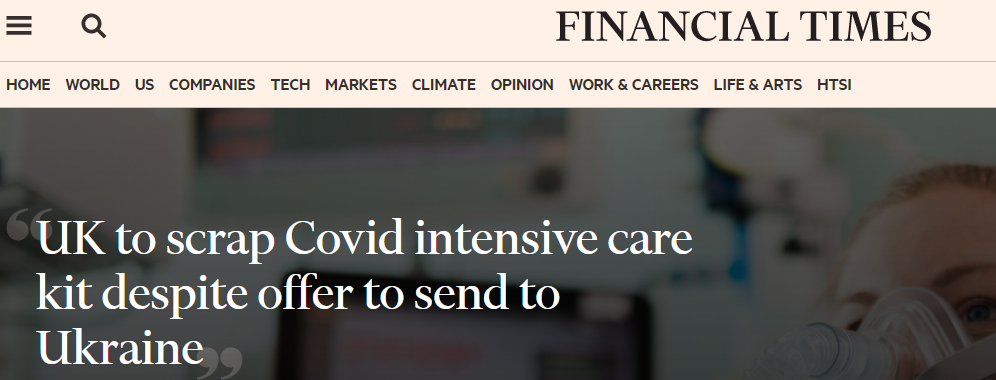 Правительство Великобритании должно в следующем месяце утилизировать весь запас оборудования для интенсивной терапии при пандемии коронавируса, несмотря на просьбы отправить в Украину 2 000 респираторных устройств.