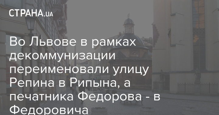 Правда, переименования коснулись людей, который к коммунизму не имеют отношения: первопечатника XVI века Ивана Федорова и художника Ильи Репина, последние 13 лет проживший в Финляндии и умерший там в 1930 году. Их фамилии переделали: Репин стал Рипын (Ріпин), а Федоров - Федоровичем.