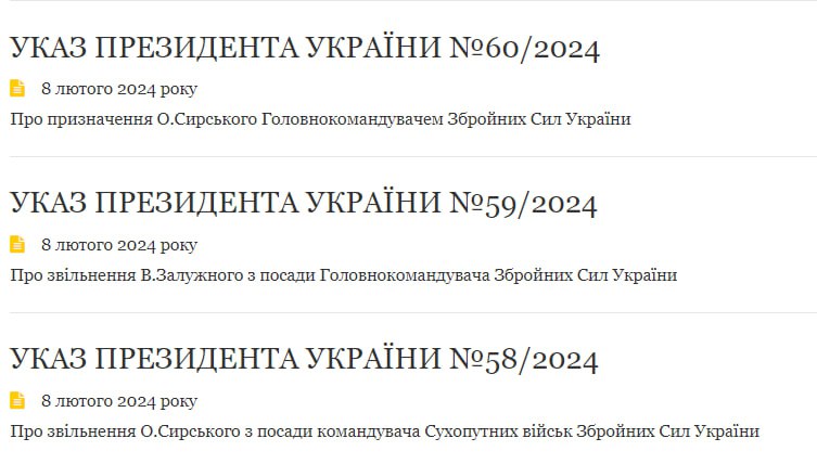 В четверг, 8 февраля, на сайте Офиса президента появились указы об увольнении Валерия Залужного и назначении Александра Сырского главкомом ВСУ.
