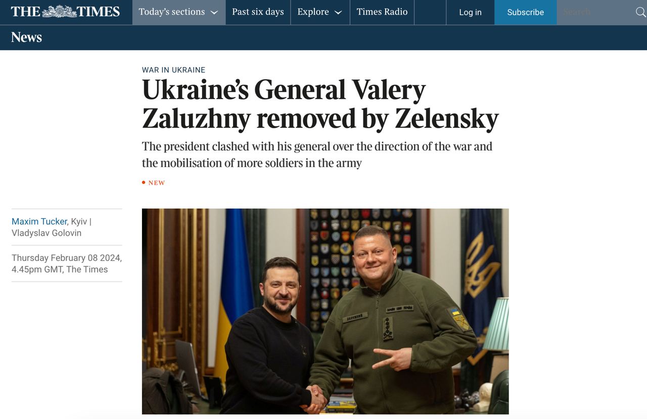 "Считал нереалистичными приказы Зеленского". The Times о причинах отставки Залужного с поста главкома ВСУ