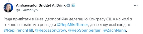 Об этом сообщила в соцсети Х посол США Бриджит Бринк.