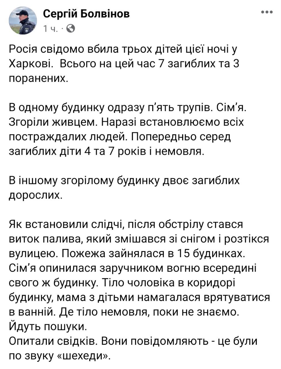 Глава Харьковской ОВА сообщал о семи погибших, среди них трое детей: 7, 4 лет и ребенок около 6 месяцев. Некоторые дома сгорели полностью, десятки получили повреждения.