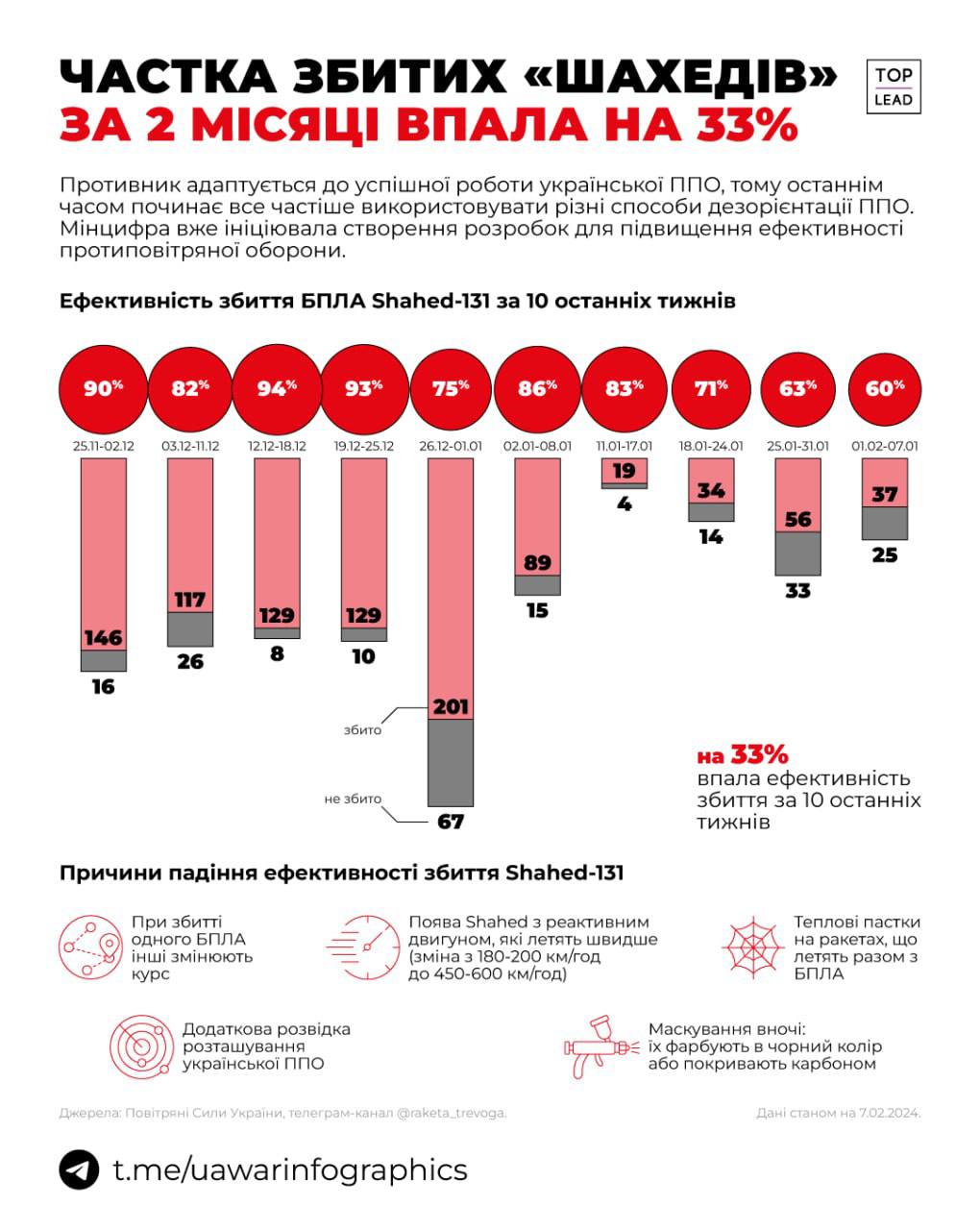 В декабре эффективность действий ПВО против беспилотников составляла около 90% и выше. Однако в январе результаты начали ухудшаться, и в начале февраля снизились до 60%.